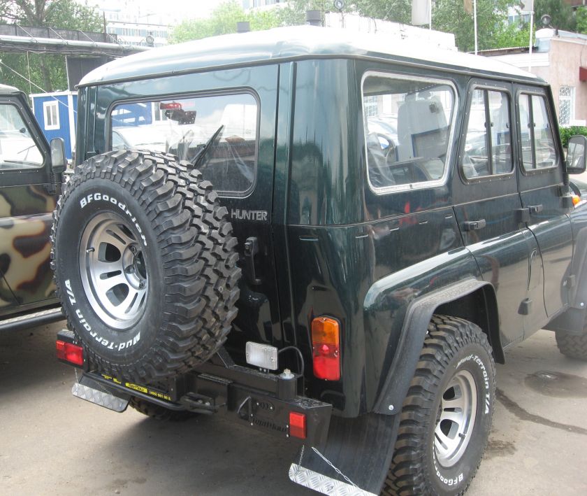 УАЗ, OJ c кронштейном Бампер задний с кронштейном запасного колеса OJ 003.02. Для моделей: УАЗ Hunter. Бампер оснащен защитой фонарей заднего хода, мощной буксирной проушиной, открывашкой и кронштейном крепления запасного колеса, установленном на 2-х подшипниках, и надежно фиксирующимся в закрытом положении замком оригинальной конструкции. На калитку допускается установка колес 35` включительно, вылет площадки крепления запаски составляет 150мм. Бампер крепится к раме на четырех кронштейнах, допускается подъем автомобиля домкратом с упором в бампер, доработки под установку не требуются, 3 положения для установки (от стандартного до лифтованного кузова). Бампер сертифицирован.